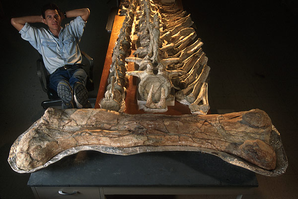 ANCIENT BONES Paul Sereno, paleontologist with the University of Chicago, is dwarfed by his dinosaur find: tail vertebrae and a femur of Jobaria tiguidensis, a species he discovered in 1997 in the Sahara desert. The animal lived 130 million years ago in the Cretaceous period and was named after Jobar, a figure from Tuareg mythology. |