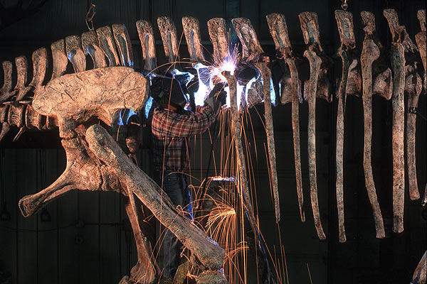 ASSEMBLY PAST co-founder Keith Russell welds ribs to the half-finished, reconstructed skeleton of a juvenile Jobaria dinosaur. The reconstructed bones are made of epoxy resin, but have a steel core.